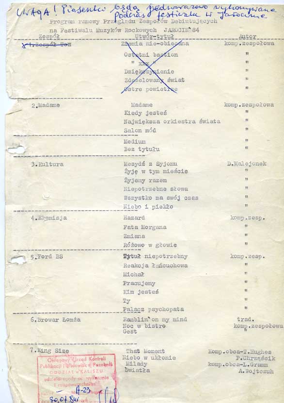 Kilkanaście kartonów, zawierających dokumenty z jarocińskich festiwali z lat 80. i początku 90. zostało odnalezionych w Jarocinie. Przez ponad 25 lat leżały zakurzone w magazynie Jarocińskiego Ośrodka Kultury. Najcenniejsze znaleziska to teczki z tekstami zespołów występujących w roku 1984 (m. in. T. Love, Siekiera, Madame, Made in Poland, Izrael, Moskwa) z pieczęciami Urzędu Kontroli Publikacji i Widowisk (UKPiW), czyli organu cenzury W niektórych przypadkach cenzorzy dokonywali ingerencji w tekst. Tak się stało chociażby z piosenką "Wychowanie" zespołu T. Love, gdzie pracownik UPWiW wykreślił refren "Ojczyznę kochać trzeba i szanować/ Nie deptać flagi i nie pluć na godło/ Trzeba też w coś wierzyć i ufać/ Ojczyznę kochać i nie pluć na godło". Jak dziś wspominają zarówno organizator Jarocin'84 Walter Chełstowski, jak lider kapeli Muniek Staszczyk, zespół nie przejął się uwagami cenzora i na wieczornym koncercie piosenka została wykonana w pełnej wersji tekstowej. Podobnie odbywało się w przypadku innych wykonawców, którzy raczej nie respektowali ograniczeń narzucanych przez pracowników organu cenzury. W teczkach znajdują się też teksty zespołów, które nie stały się legendami „Jarocina” ani polskiej muzyki rockowej. Ich twórczość nie została nigdy zarejestrowana i wydana. Kapele przestawały istnieć po festiwalu, ale ich twórczości stanowi dziś znaczący wkład w polską muzykę rockową. Znalezione dokumenty znajdą się w zbiorach powstającego Spichlerza Polskiego Rocka w Jarocinie - instytucji, których celem jest zbieranie, archiwizowanie, badanie i udostępnianie dzieł związanych z polską muzyką rockową. Niewykluczone, że odnalezione teksty, zwłaszcza zapomnianych zespołów, zostaną wydane w najbliższych latach w formie książkowej. Projekt Spichlerz Polskiego Rocka w Jarocinie został dofinansowany ze środków Unii Europejskiej w ramach Wielkopolskiego Regionalnego Programu Operacyjnego.