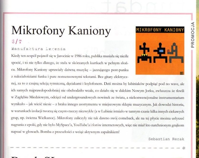 Polecamy artykuł Piotra Kanikowskiego okraszony rozmową z członkami zespołu w "Gazecie Wrocławskiej - POLSKA The Times". http://www.gazetawroclawska.pl/magazyn/187918,mikrofony-kaniony-reaktywacja,id,t.html | ||||||||||||||||||||||||||||||||||||||||||||||